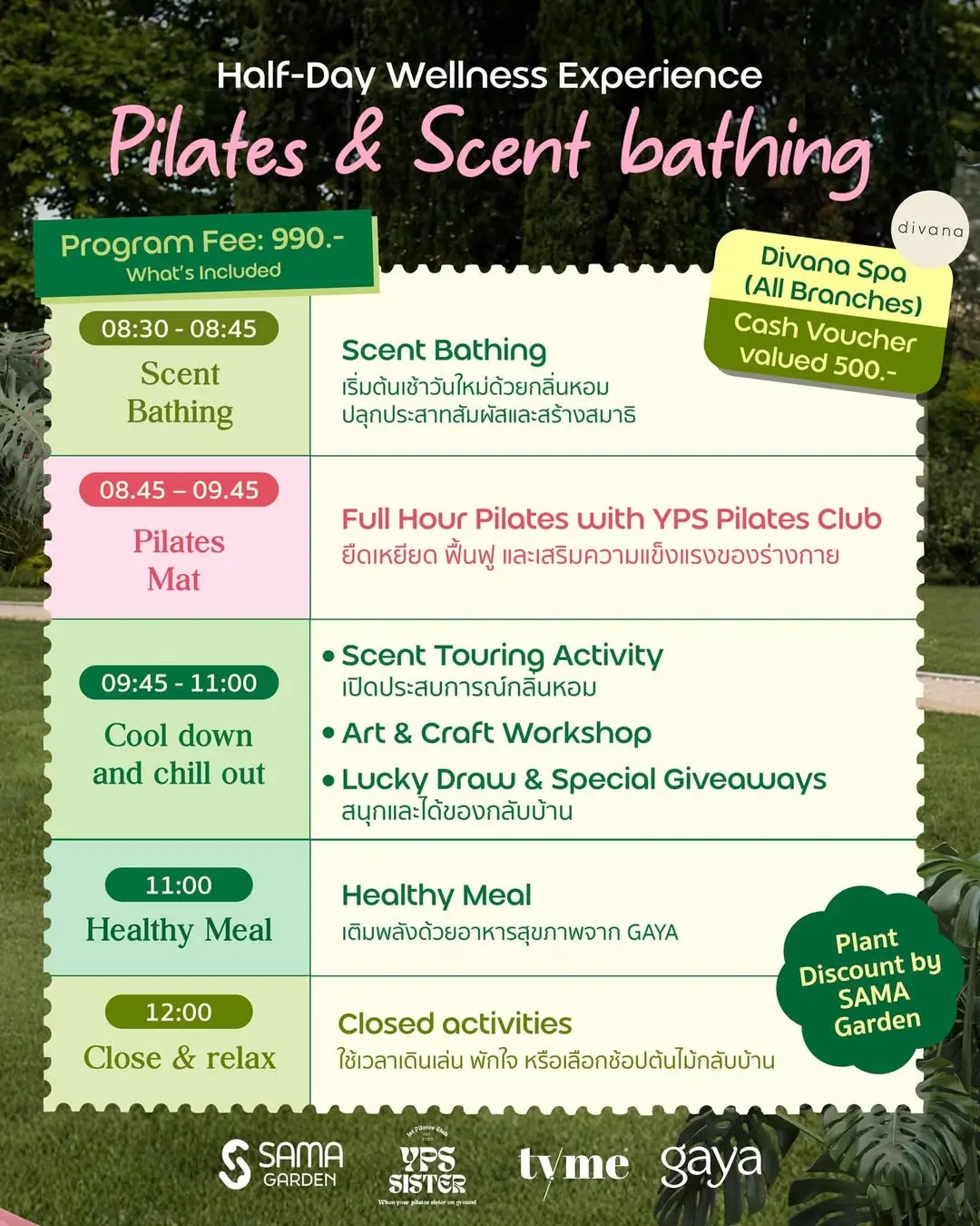พิลาทิสพร้อมกิจกรรมและอาหารสุขภาพ ชิลเอ้าท์ในบรรยากาศสวน